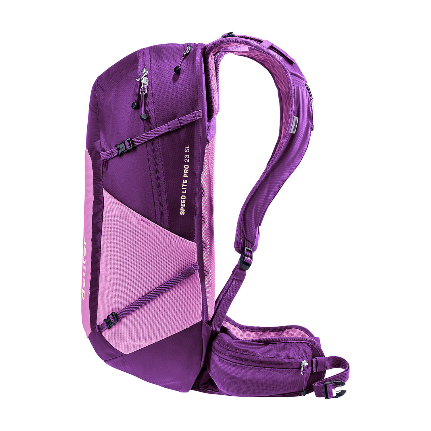 背負ったときの荷重がバランスよくしっかりと腰へ伝わり、背面の通気性を保ちながらも高いフィット感を得られる新たな背面パネルを用いた軽量パックです。ファスナーポケットを設けたショルダーストラップには柔らかく、軽量で通気性に優れたエアメッシュを採用しています。装備を背負い歩いたときに快適さを得られるか否かは素材の軽さだけではないと考えるドイターの哲学が具現化したモデルです。製品名につくSLは女性向けモデルであることを示します。