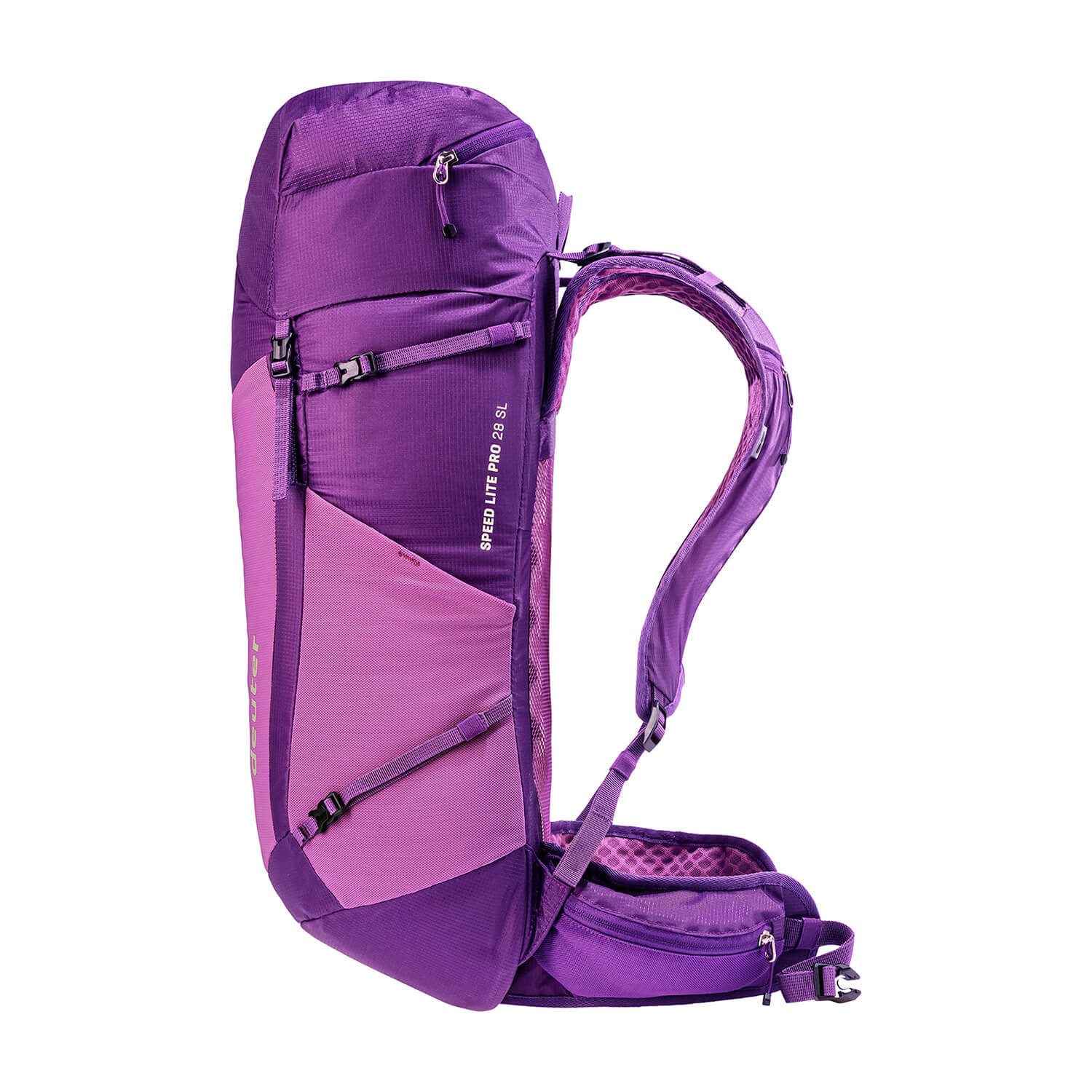 背負ったときの荷重がバランスよくしっかりと腰へ伝わり、背面の通気性を保ちながらも高いフィット感を得られる新たな背面パネルを用いた軽量パックです。ファスナーポケットを設けたショルダーストラップには柔らかく、軽量で通気性に優れたエアメッシュを採用しています。装備を背負い歩いたときに快適さを得られるか否かは素材の軽さだけではないと考えるドイターの哲学が具現化したモデルです。製品名につくSLは女性向けモデルであることを示します。
